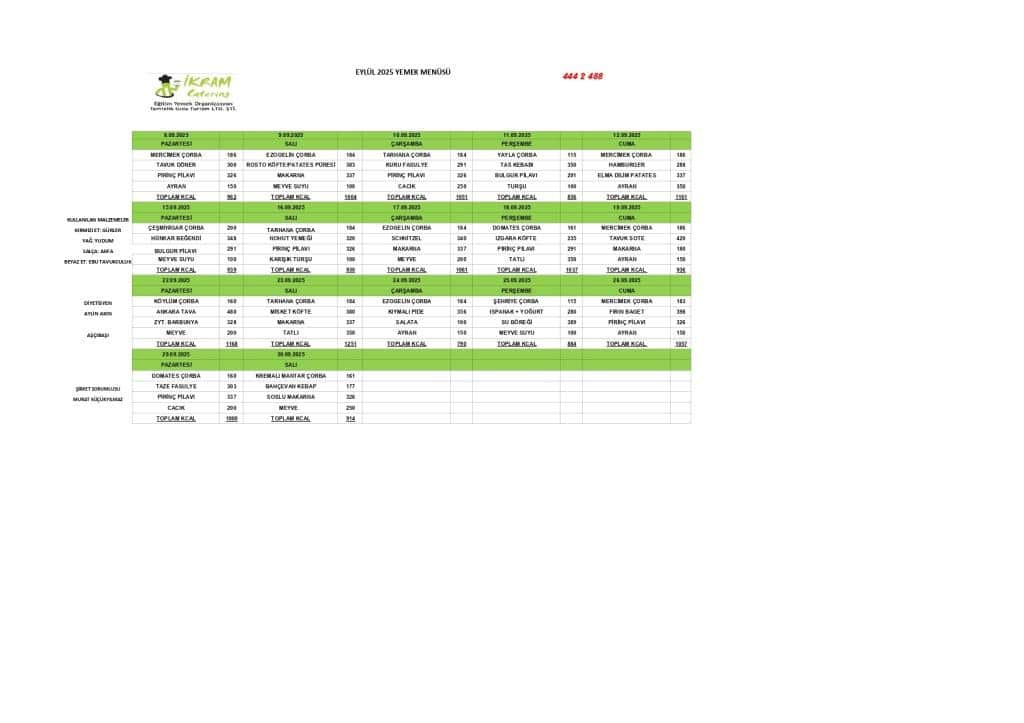 Okulumuz Eylül 2025 güncel Yemek Menüsü ektedir.